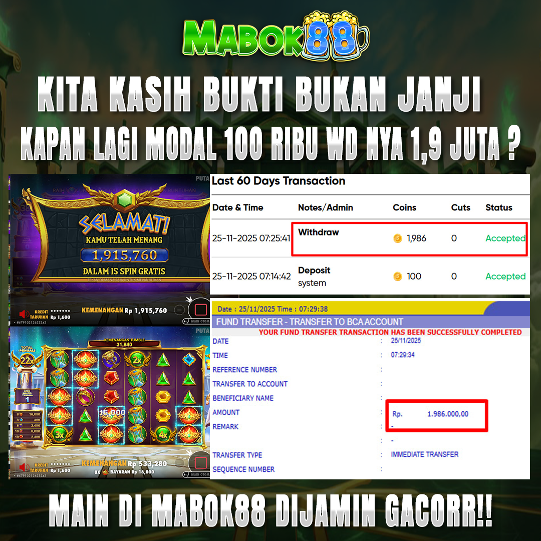 SURGAWIN288 menghadirkan game jackpot vip yang di lengkapi fitur khusus new member hanya dengan modal deposit 100k dijamin akan withdraw 1,9+ juta malam ini.